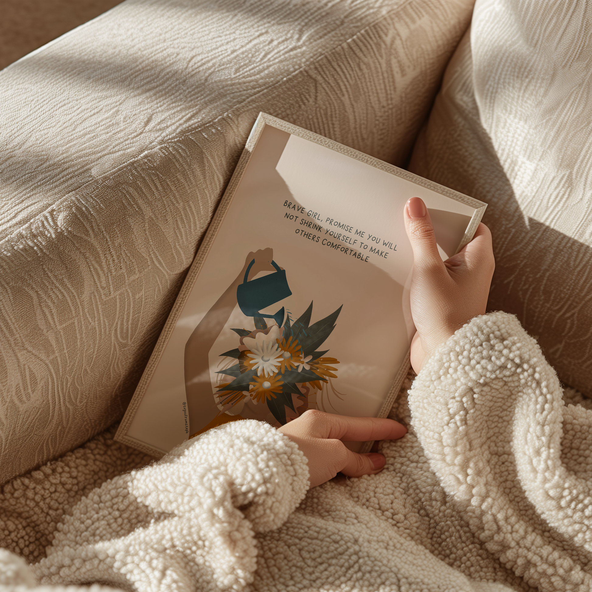 Elevate your home decor with this inspiring and motivational art print. This illustration features a powerful quote that is perfect for any woman's space. Printed on high-quality paper, this art print adds a touch of inspiration to any room. Transform your home into a haven of self-care with this beautiful print.