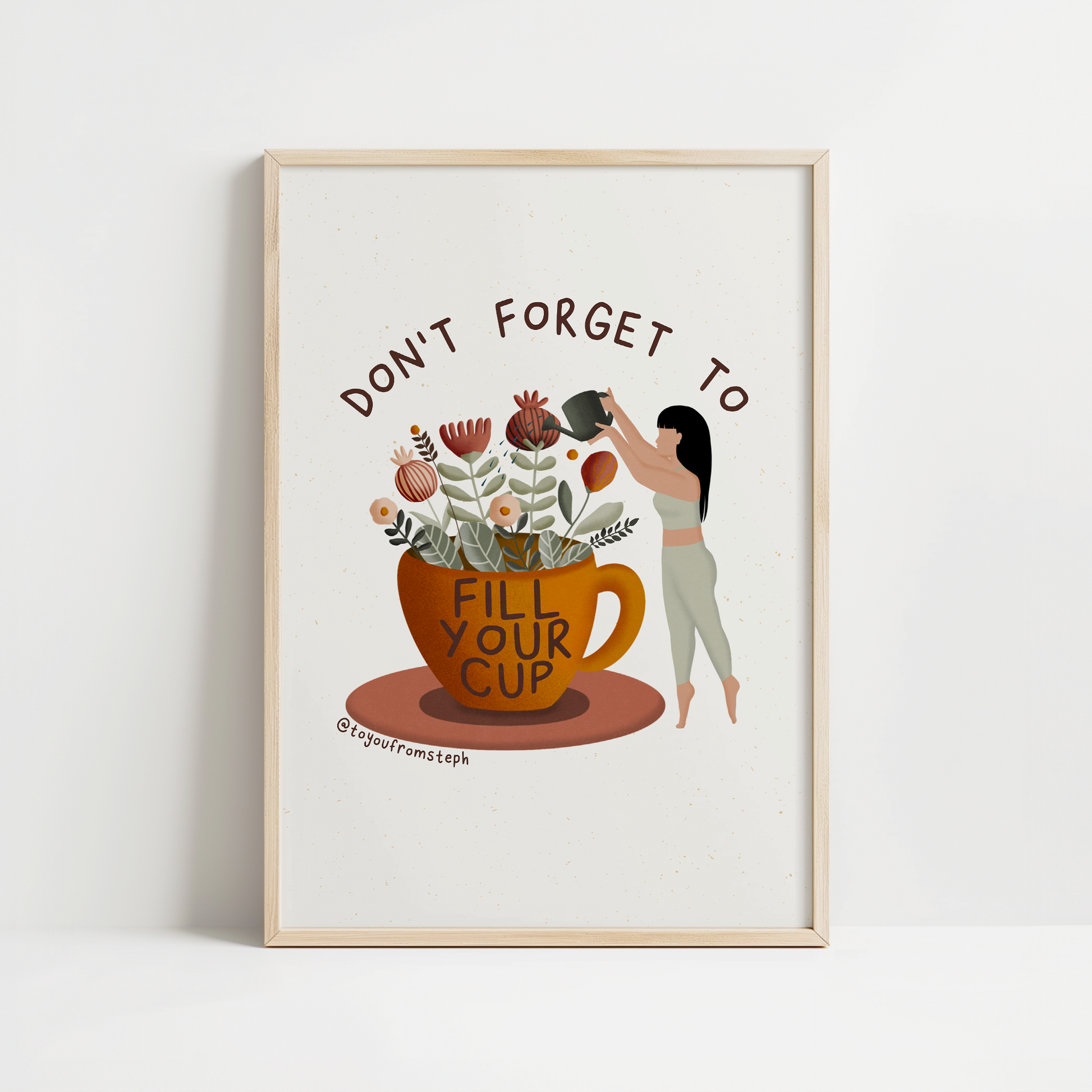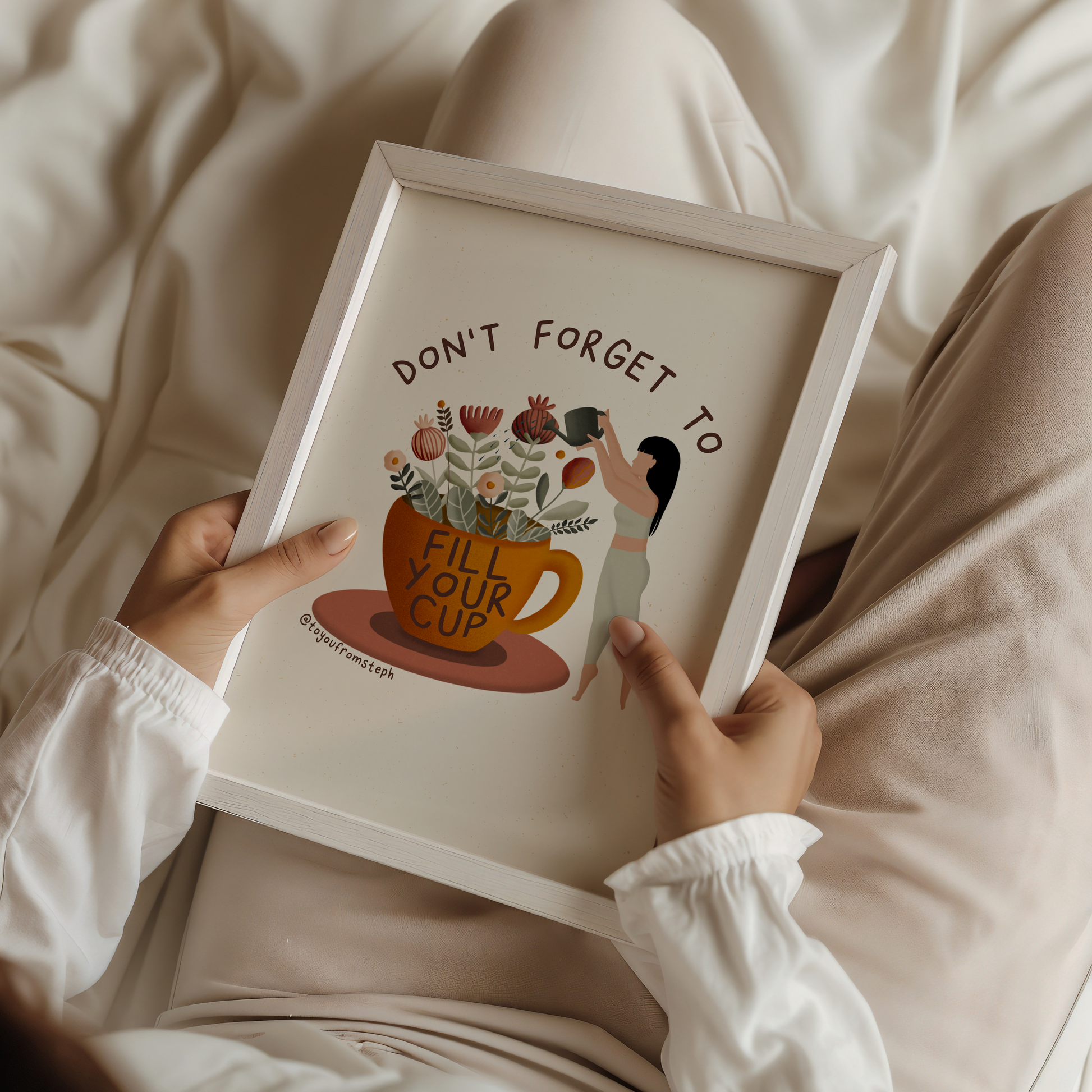 Elevate your home decor with this inspiring and motivational art print. This illustration features a powerful quote that is perfect for any woman's space. Printed on high-quality paper, this art print adds a touch of inspiration to any room. Transform your home into a haven of self-care with this beautiful print.