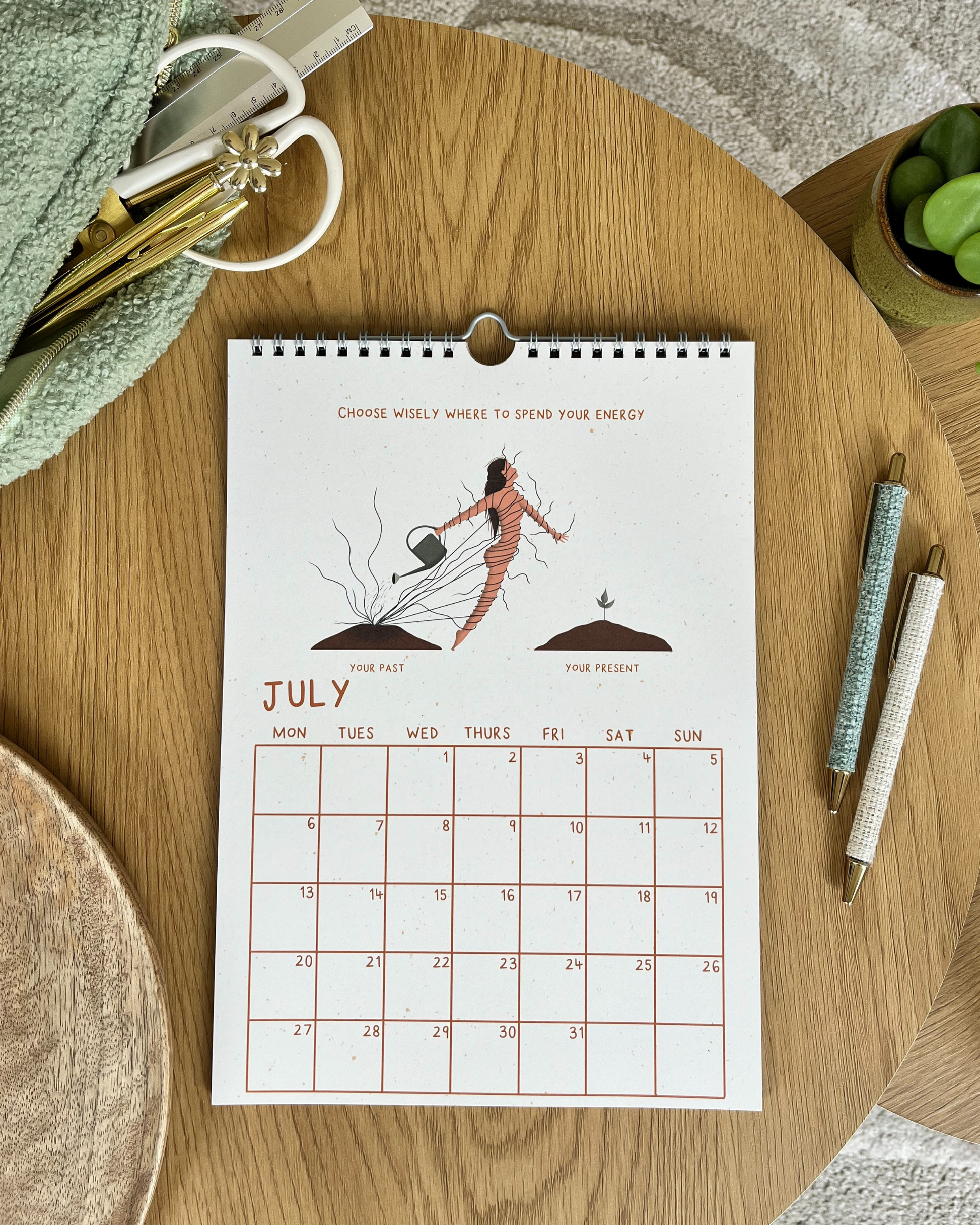Welcome each month of 2026 with art that celebrates growth and forward movement. Glow is a beautifully designed A4 calendar featuring 13 fully illustrated pages, all centred on the theme of self-care. Each artwork has been thoughtfully chosen to inspire resilience, encourage momentum, and remind you to keep stepping into your best self.