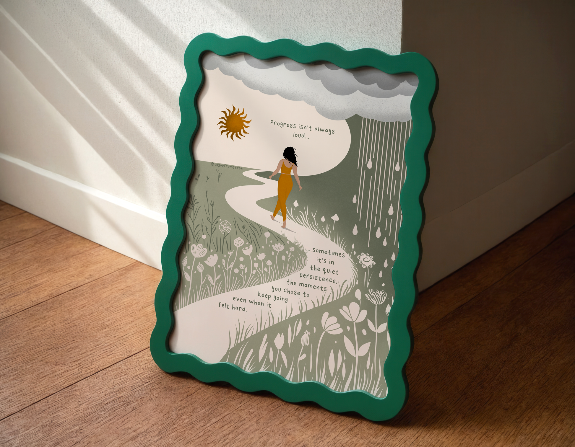 Elevate your home decor with this inspiring and motivational art print. This illustration features a powerful quote that is perfect for any woman's space. Printed on high-quality paper, this art print adds a touch of inspiration to any room. Transform your home into a haven of self-care with this beautiful print.