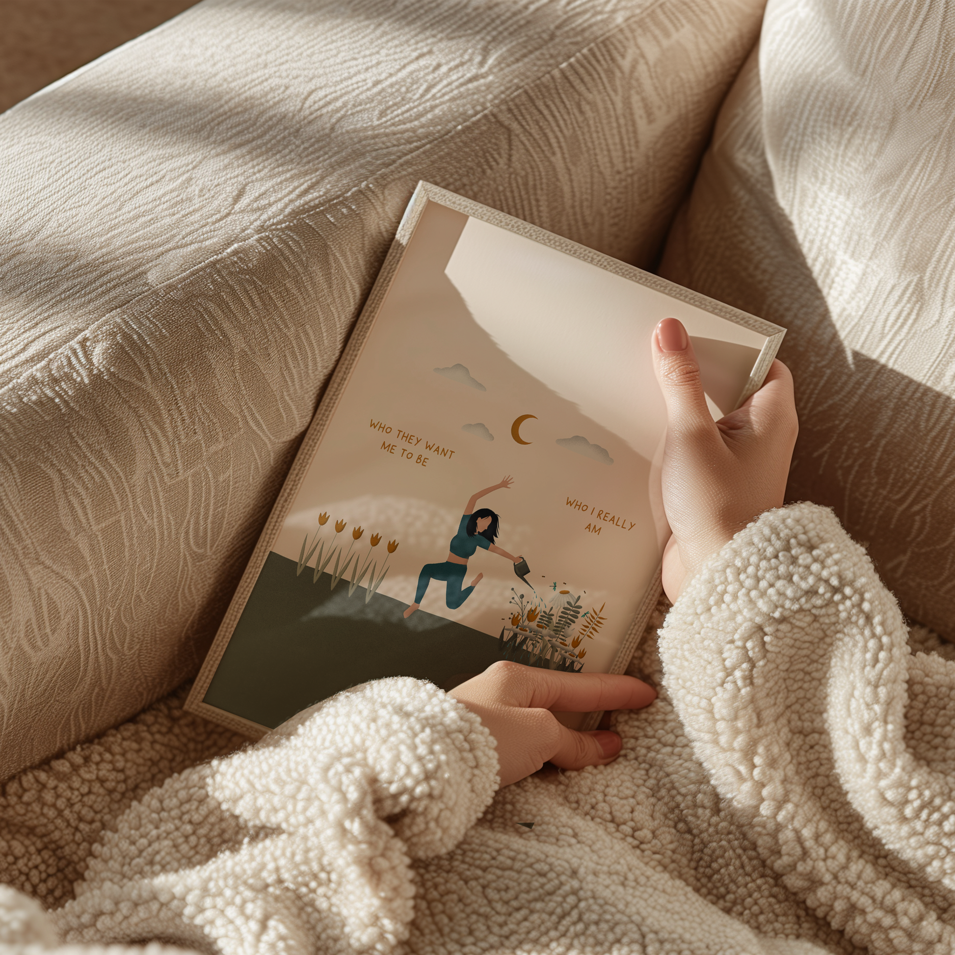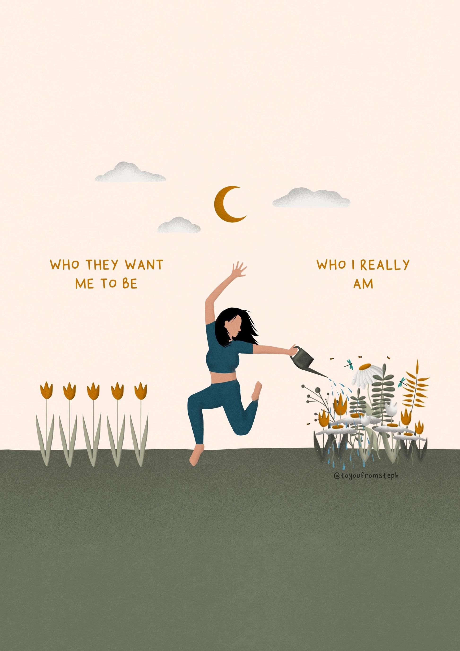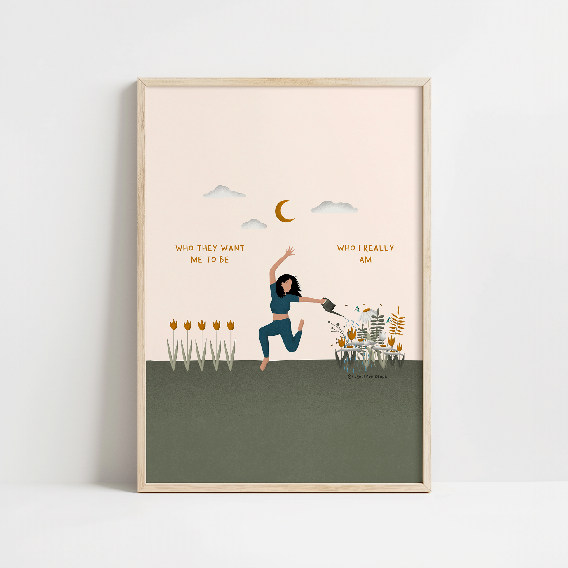 Elevate your home decor with this inspiring and motivational art print. This illustration features a powerful quote that is perfect for any woman's space. Printed on high-quality paper, this art print adds a touch of inspiration to any room. Transform your home into a haven of self-care with this beautiful print.