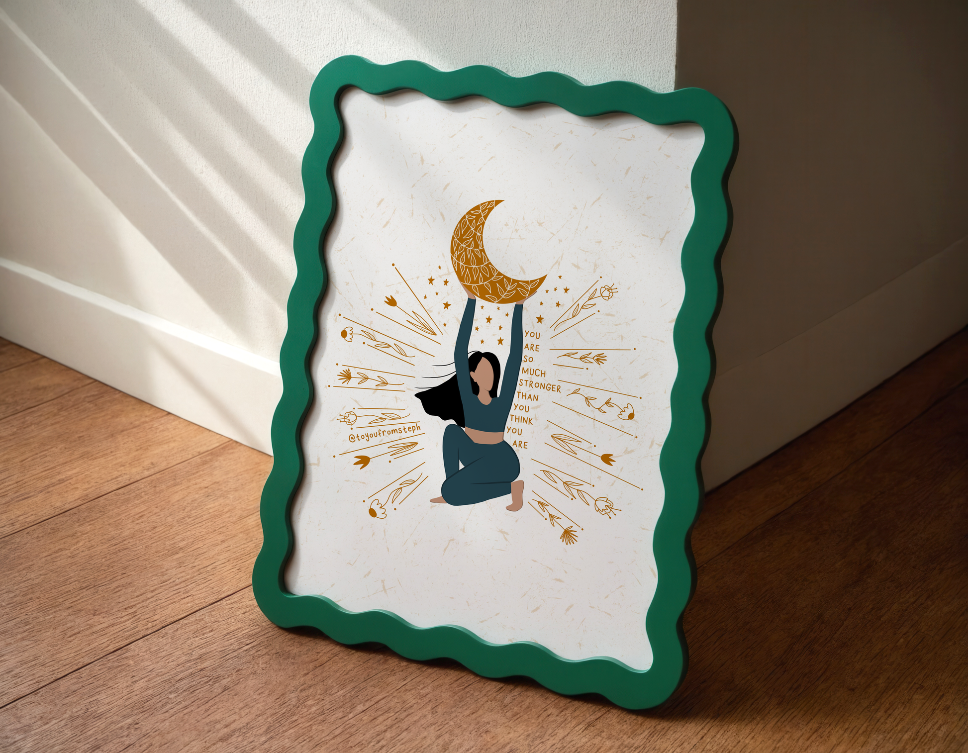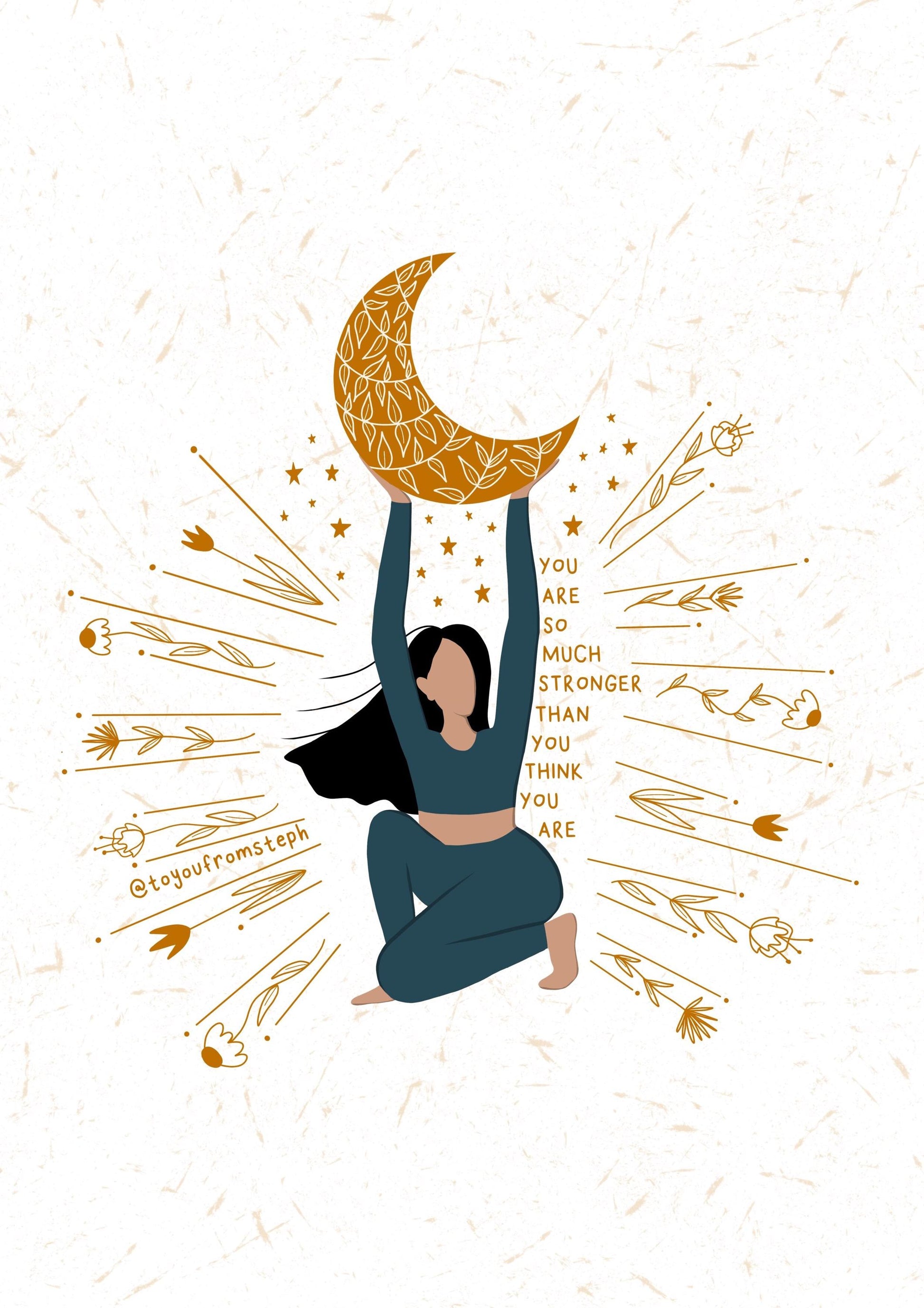 Elevate your home decor with this inspiring and motivational art print. This illustration features a powerful quote that is perfect for any woman's space. Printed on high-quality paper, this art print adds a touch of inspiration to any room. Transform your home into a haven of self-care with this beautiful print.